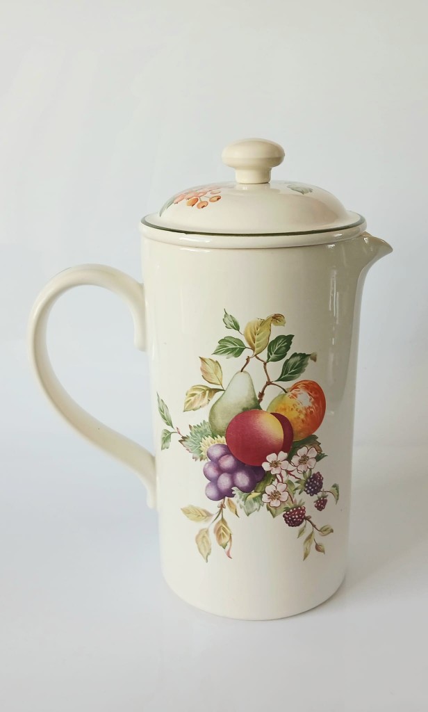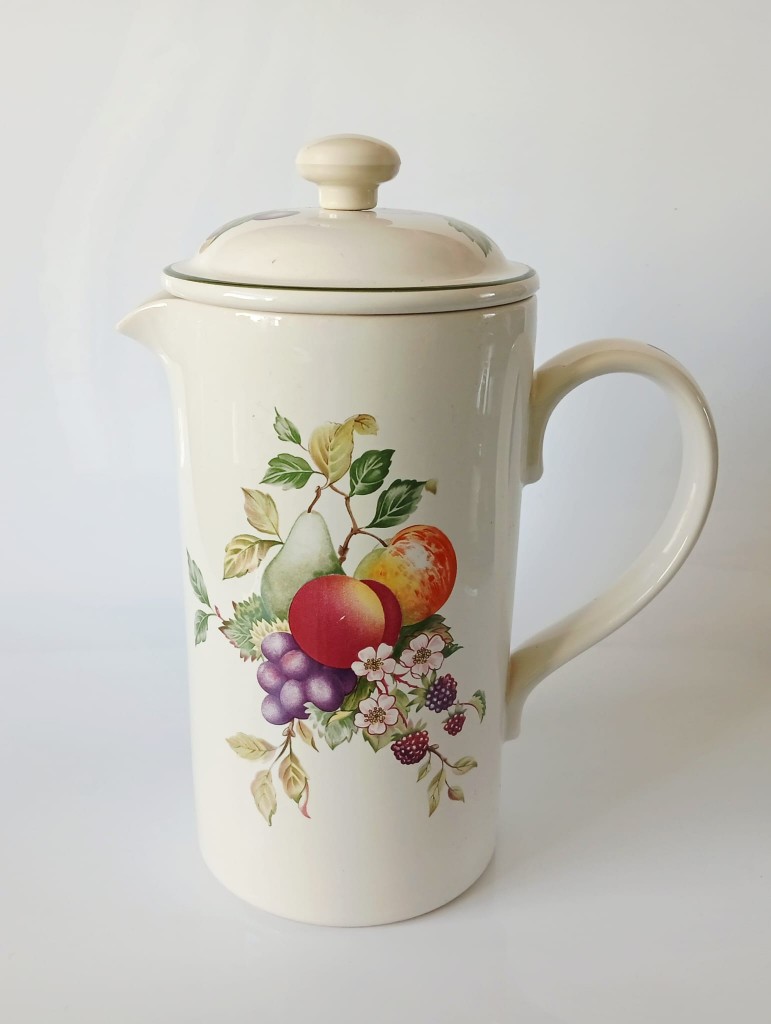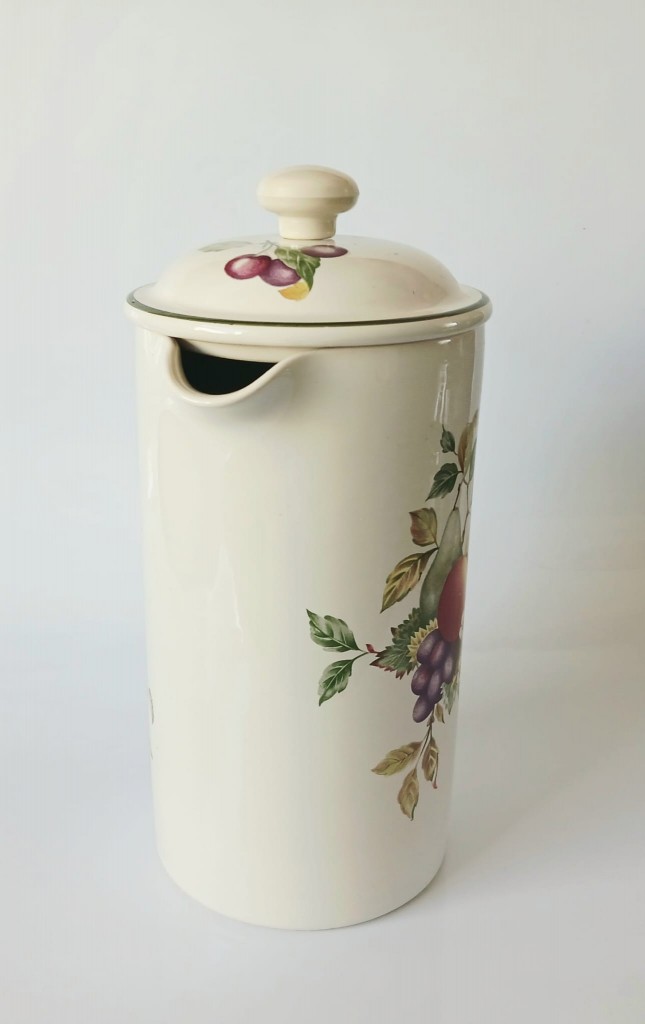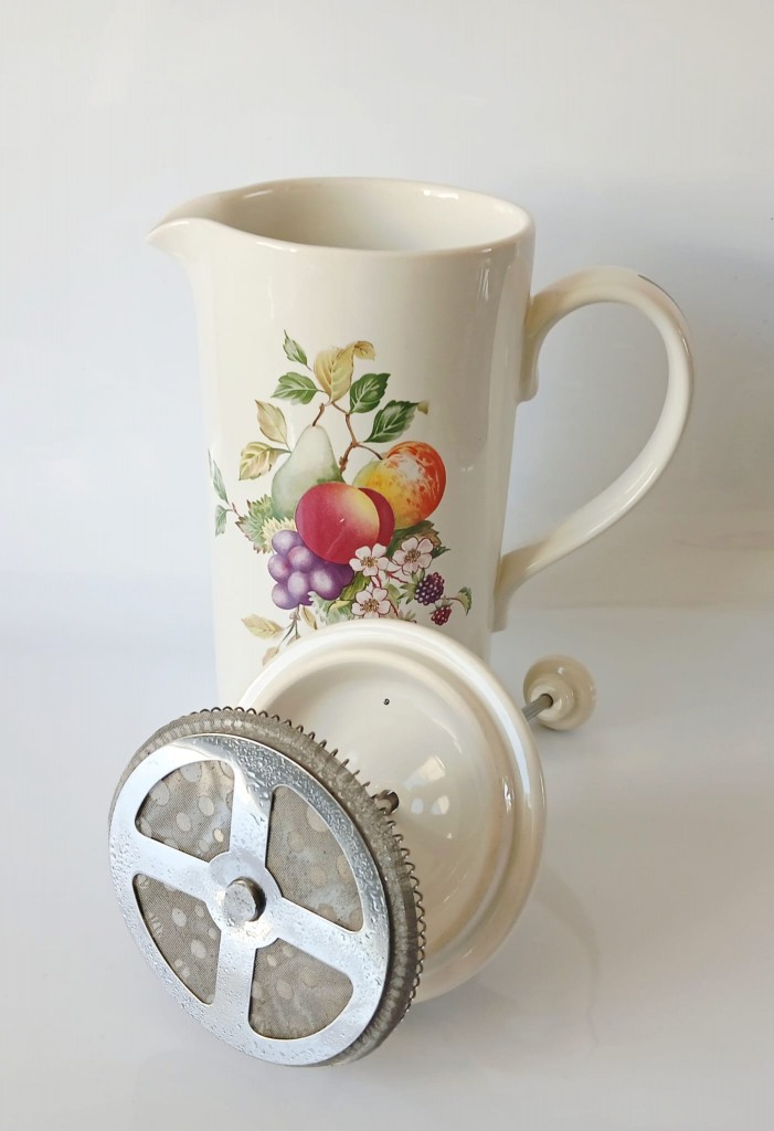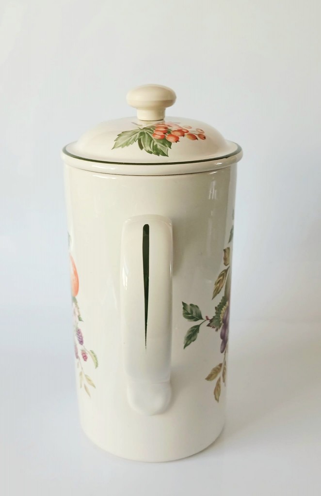 The cafetiere holds approximately 2 pints of liquid. The cafetiere measures approximately 4 inches in diameter and stands around 7 inches tall plus the lid.