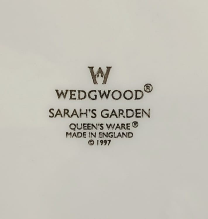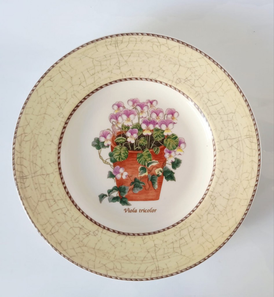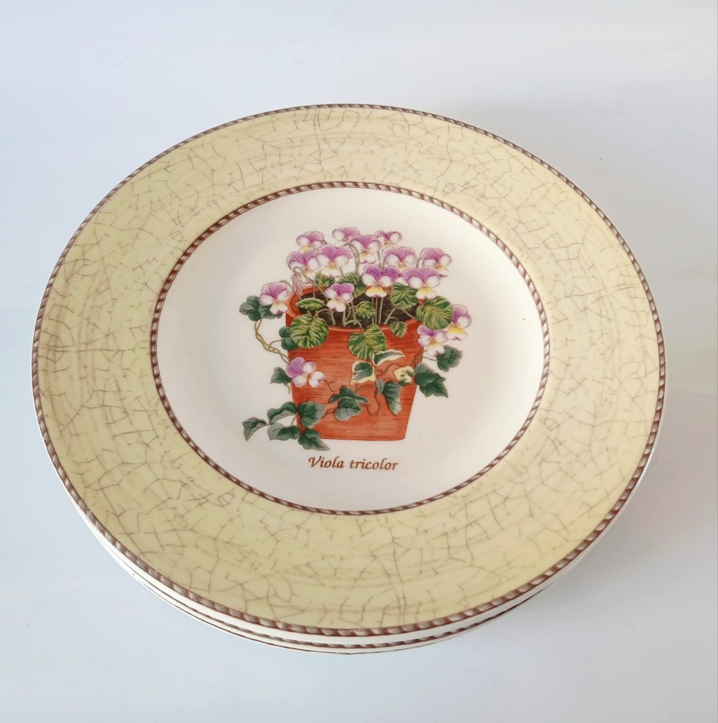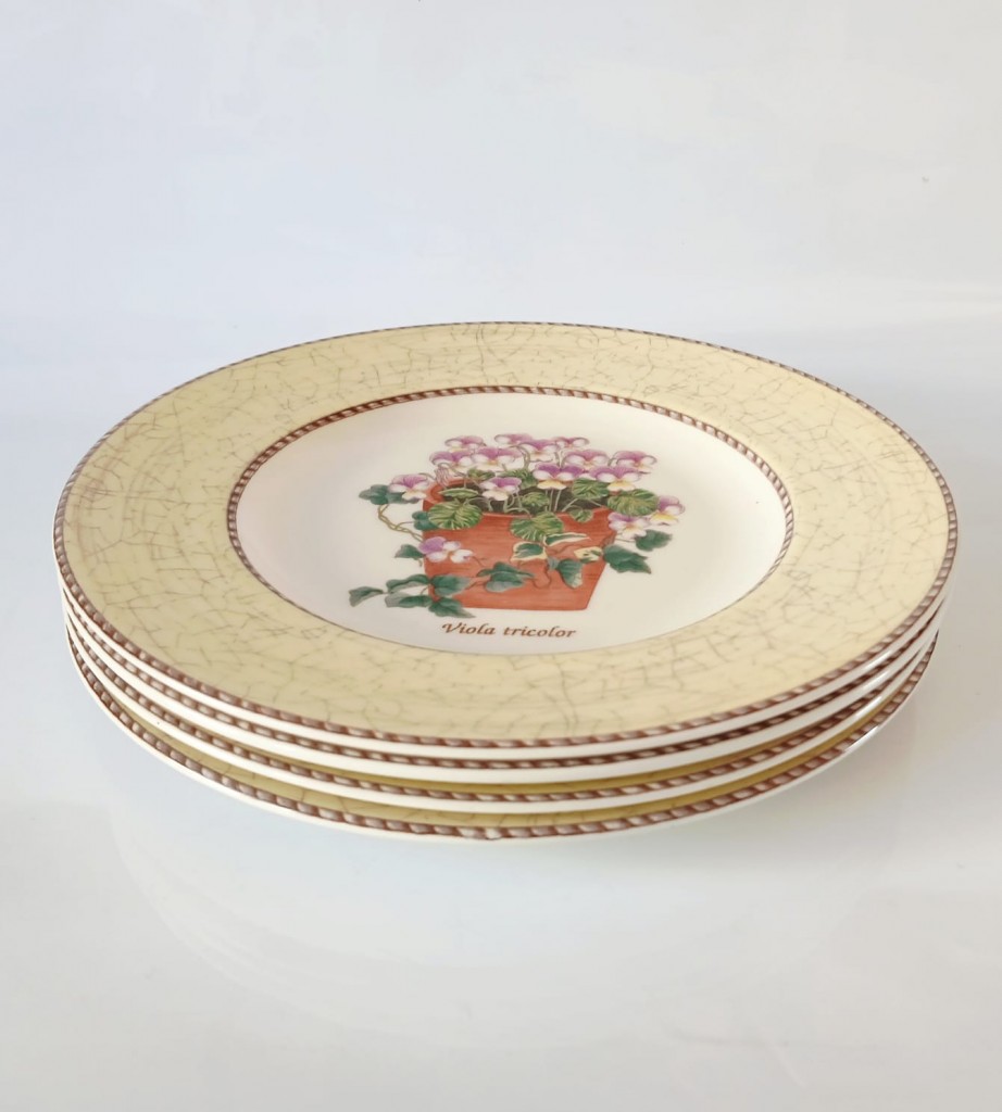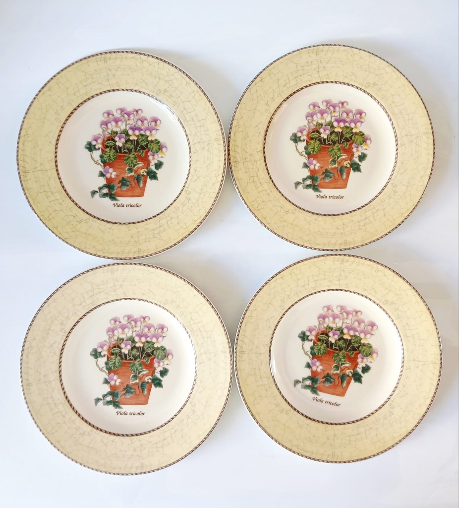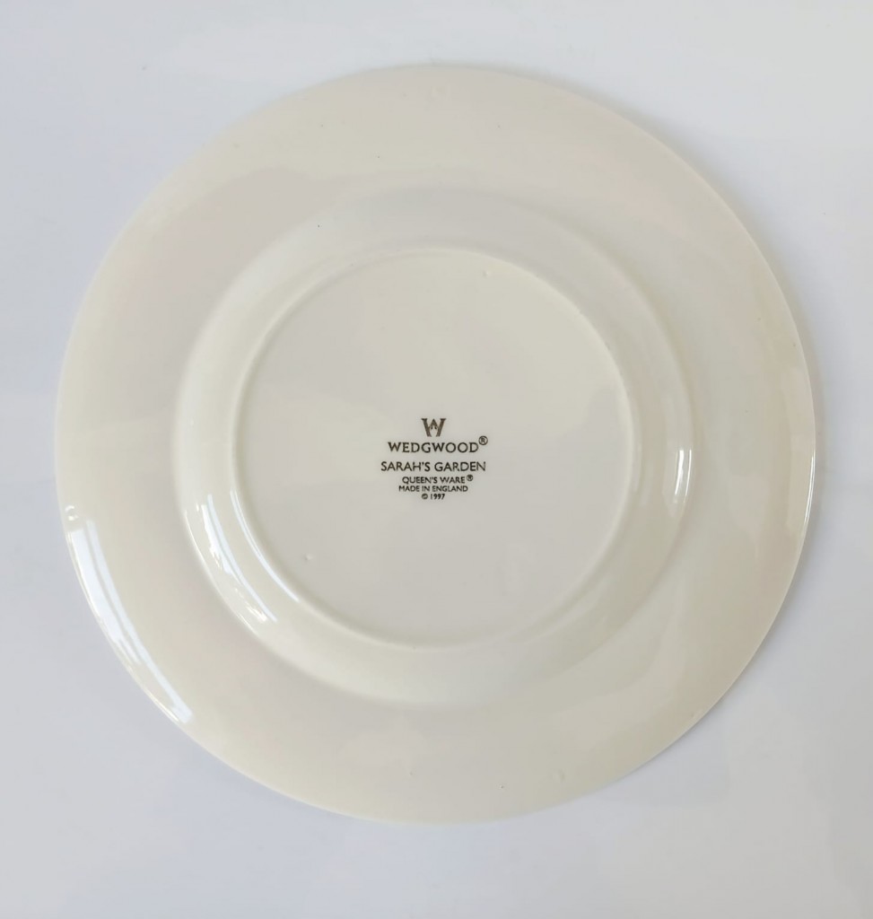 A set of four Wedgwood Sarah's Garden salad plates featuring a cream border and 'Viola Tricolor'.