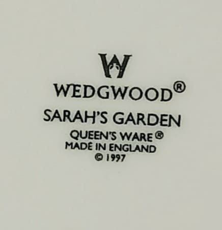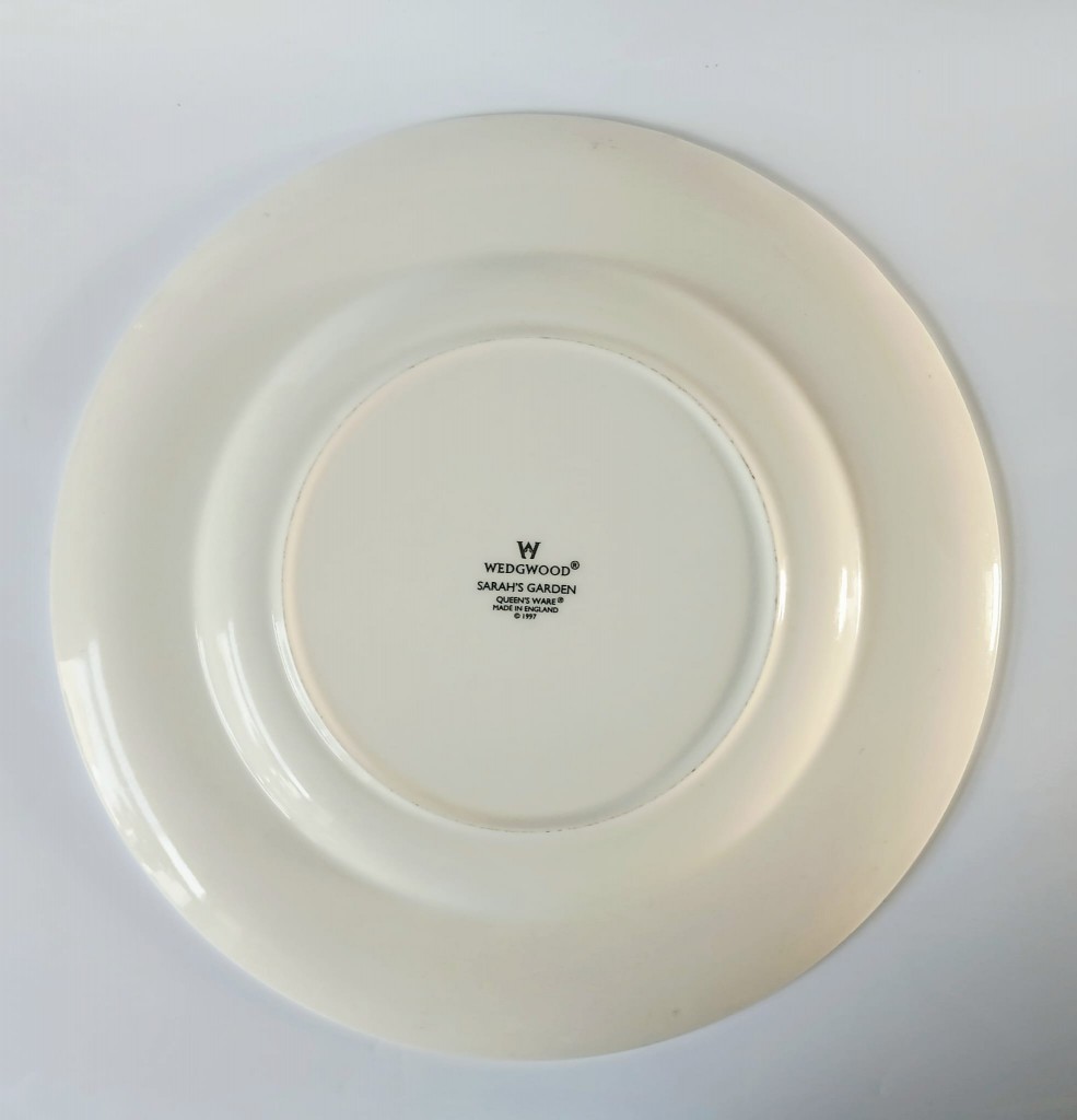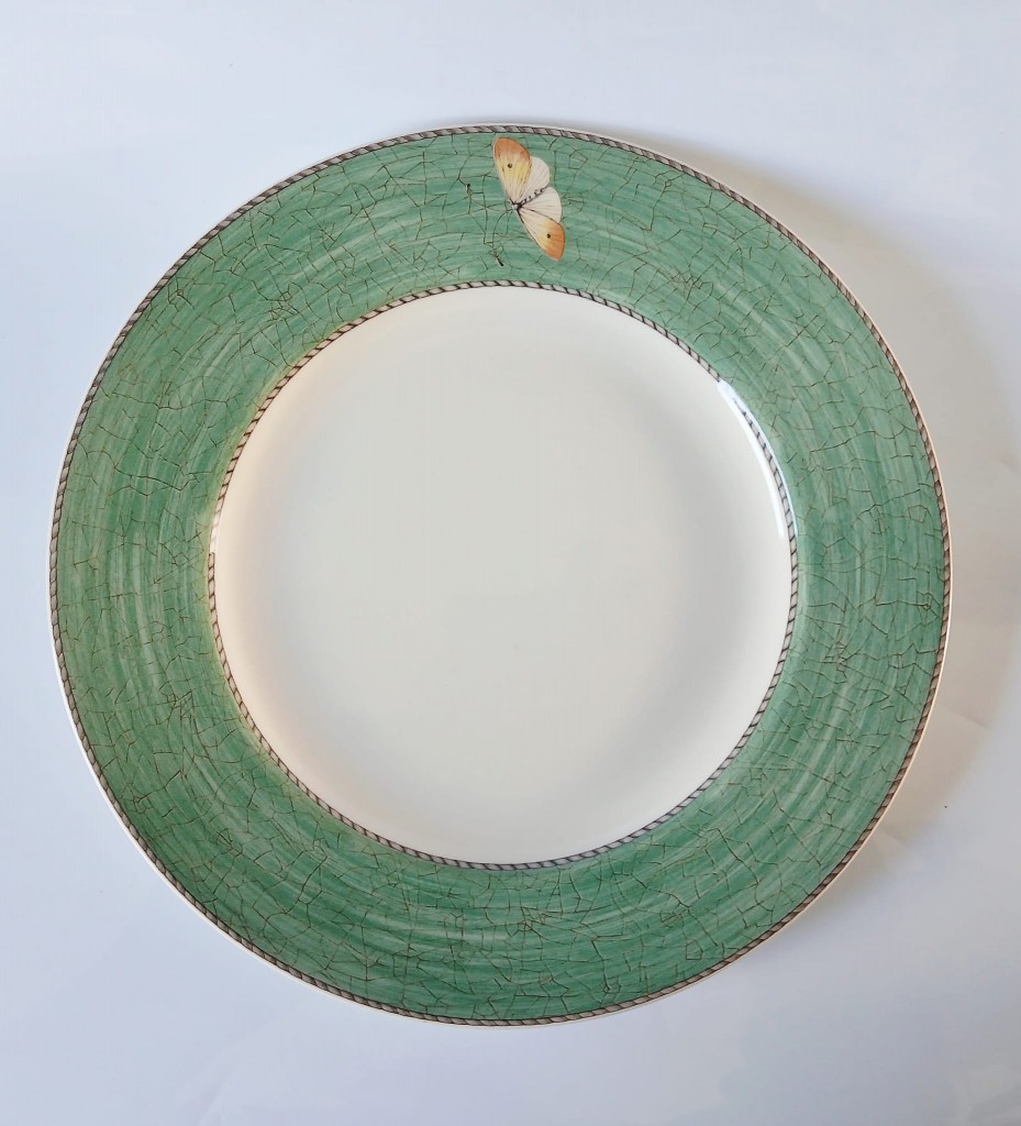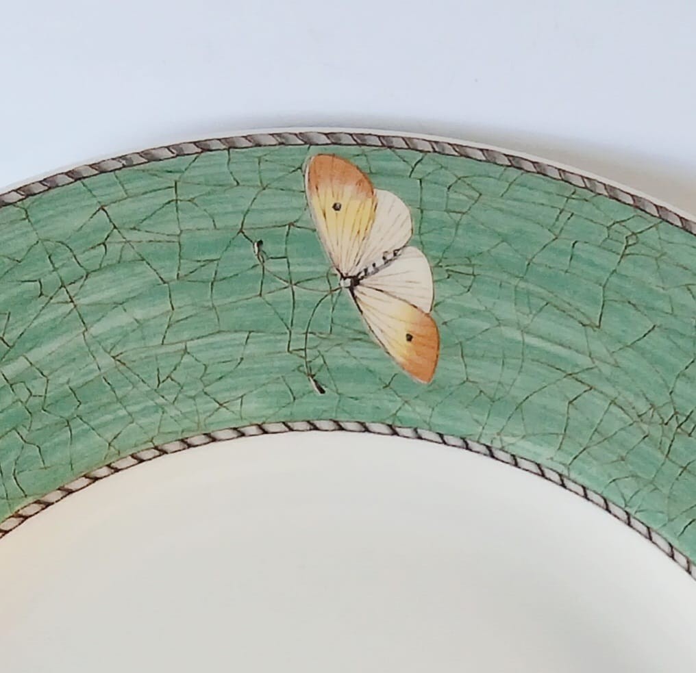A Wedgwood Sarah's Garden dinner plate featuring a green crackle border and a butterfly