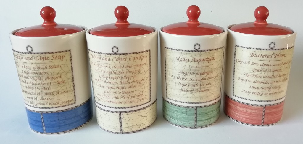 The first jar has a blue border at the base, a Citrus Aurantifolia (key lime) on the front and the ingredients needed to make your own Avocado and Lime Soup on the reverse. The second storage jar has a cream border at the base, an Olea Europaea (Olive) on the front and the ingredients needed to make your own Parsley and Caper Canapes on the reverse. The third storage jar has a green border at the base, a Citrus Limon on the front and the ingredients needed to make your own Roast Asparagus on the reverse. The fourth storage jar has a terracotta border at the base, plums on the front and the ingredients needed to make your own Buttered Plums on the reverse.