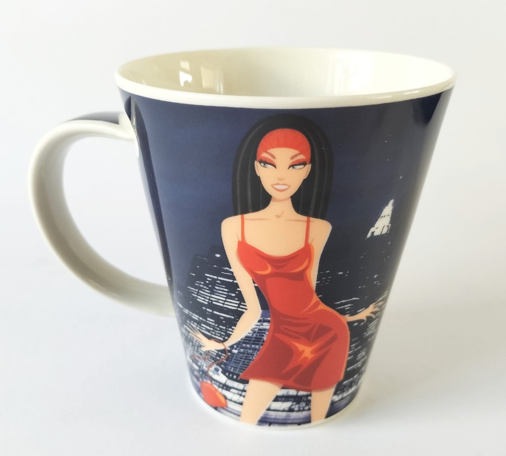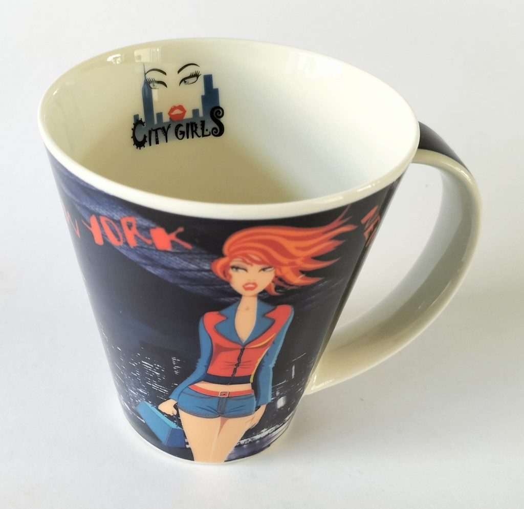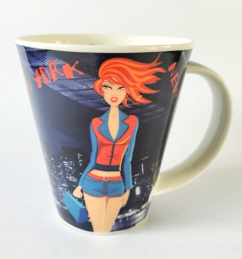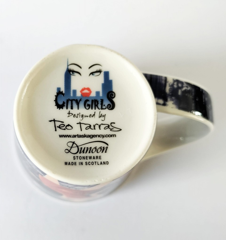 The mug features City Girls in New York based on a print by Artist Teo Terras.