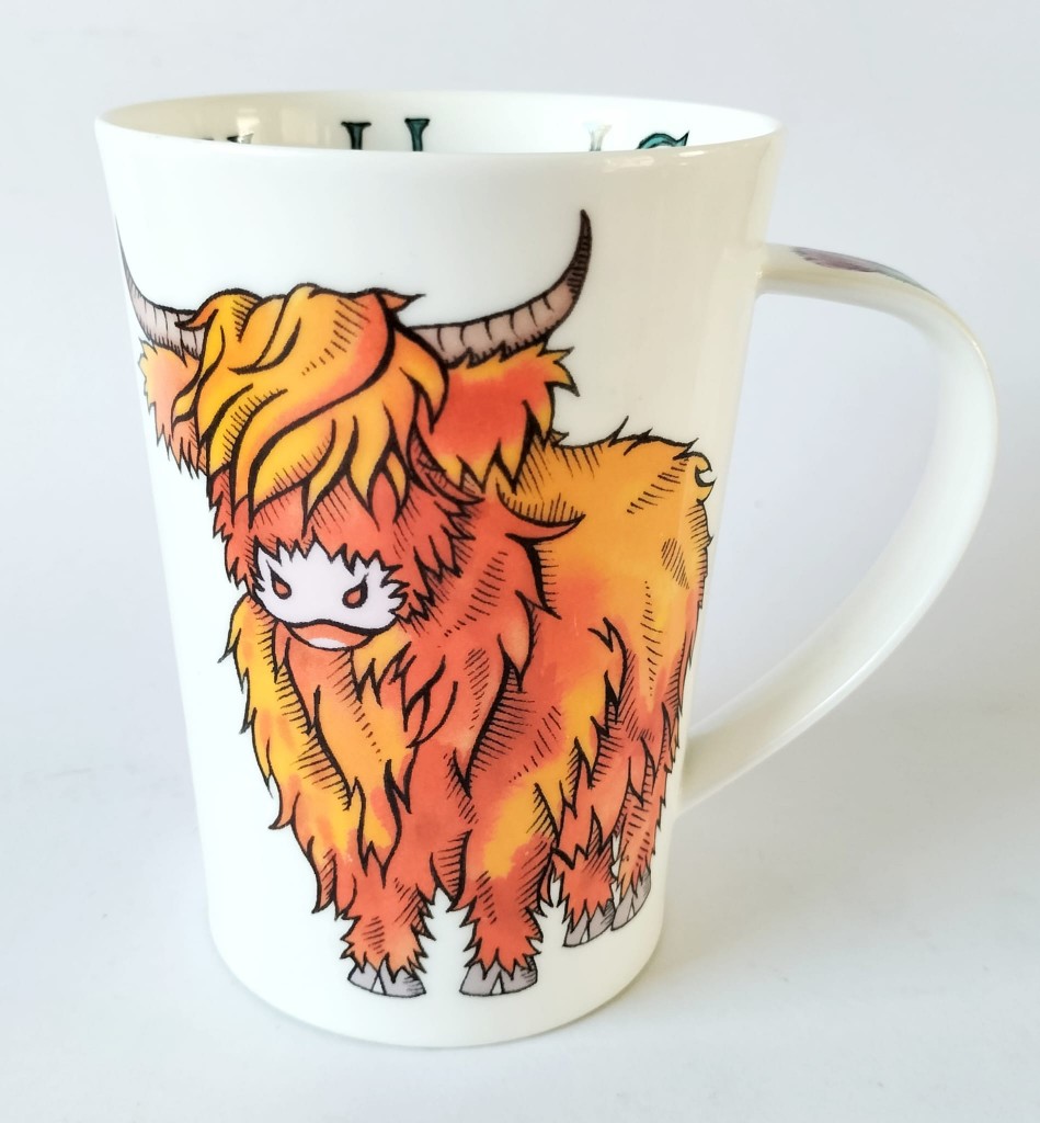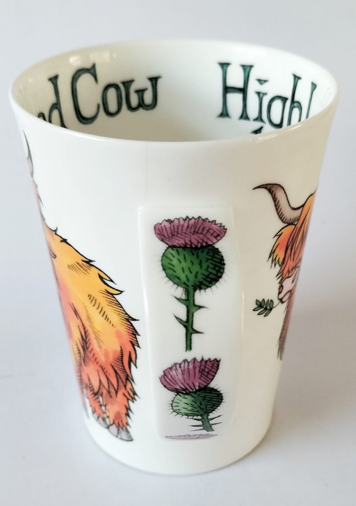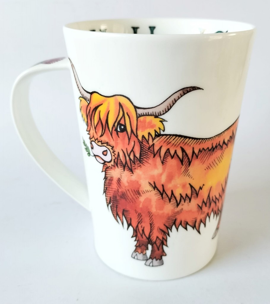 A Highland Cow Latte mug designed by Jane Brookshaw and produced by Dunoon.