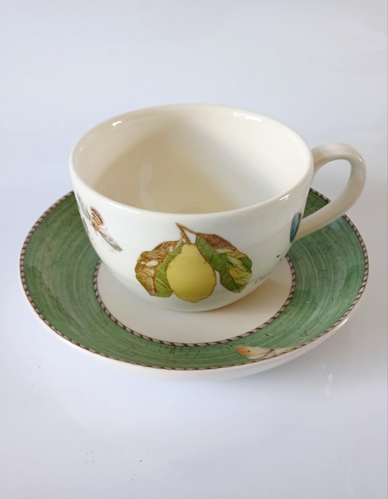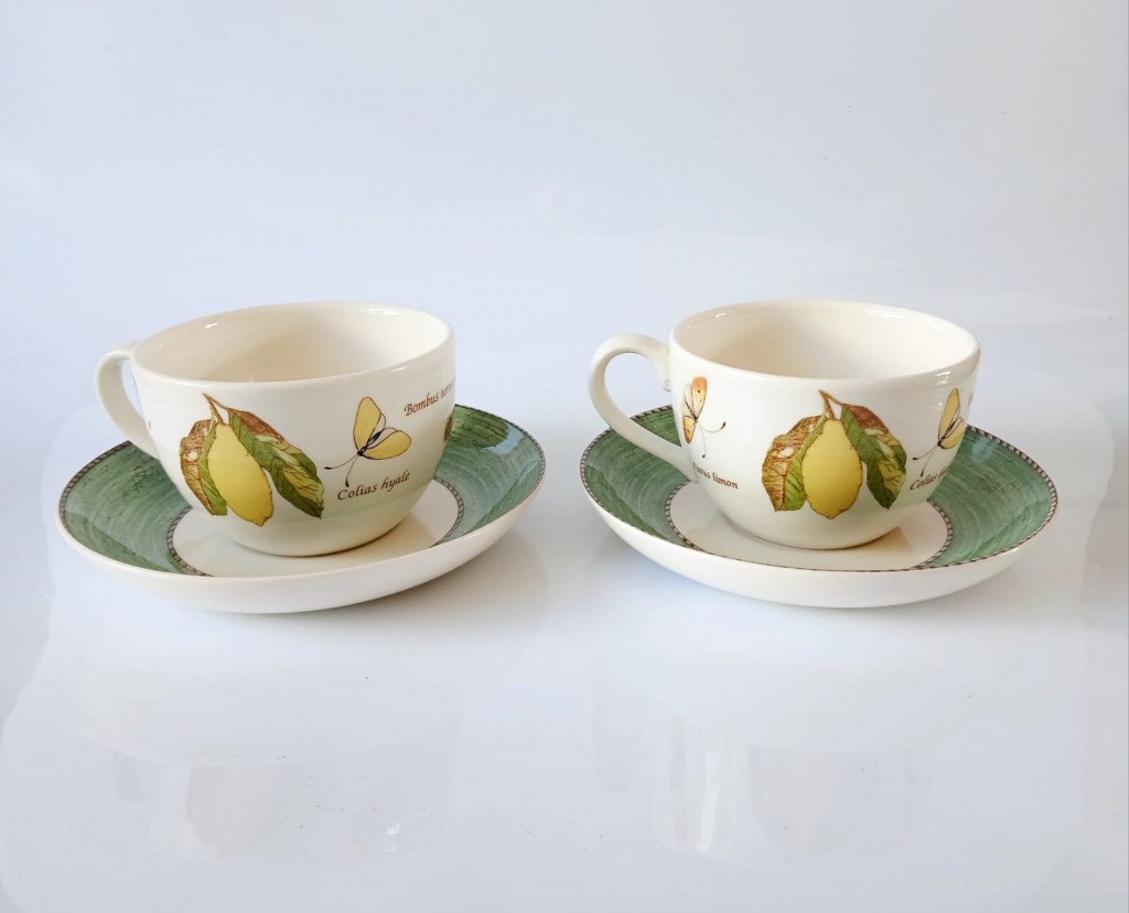 A set of two Wedgwood Sarah's Garden breakfast cups and saucers. Both cups feature Citrus Limons (lemons) along with colias hyale (butterflies) and bombus terrestris (bumble bees). The saucers have a green crackled effect rim with a butterfly.