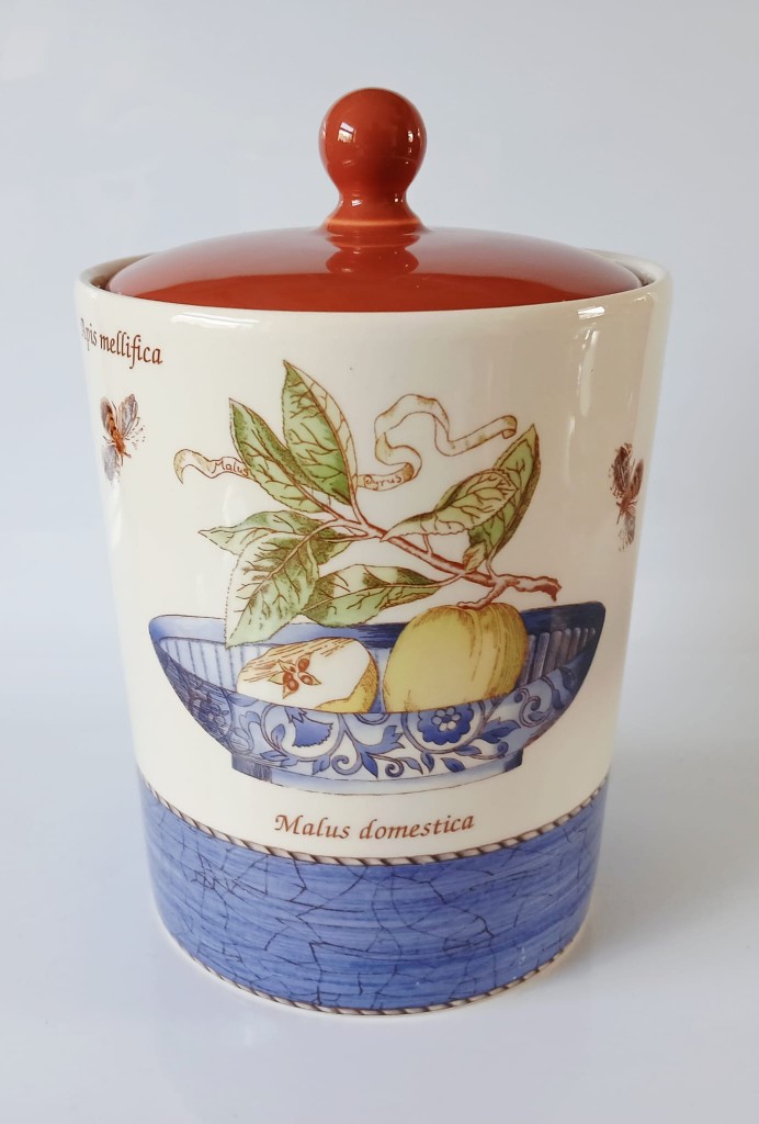 The storage jar has a blue band Malus Domestica on the front and an Apple and Cinnamon Scones recipe on the reverse.