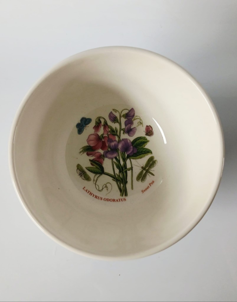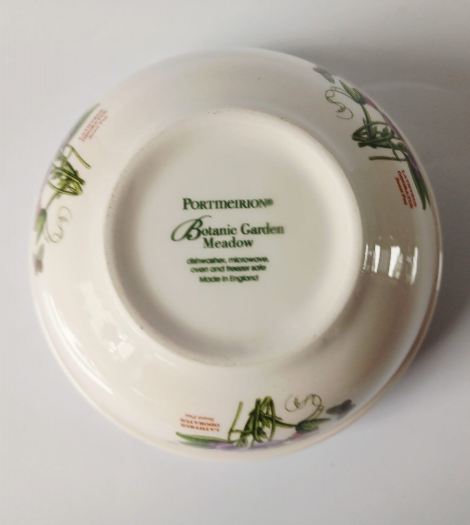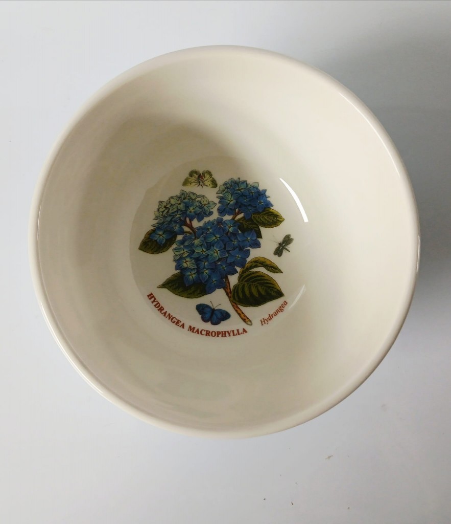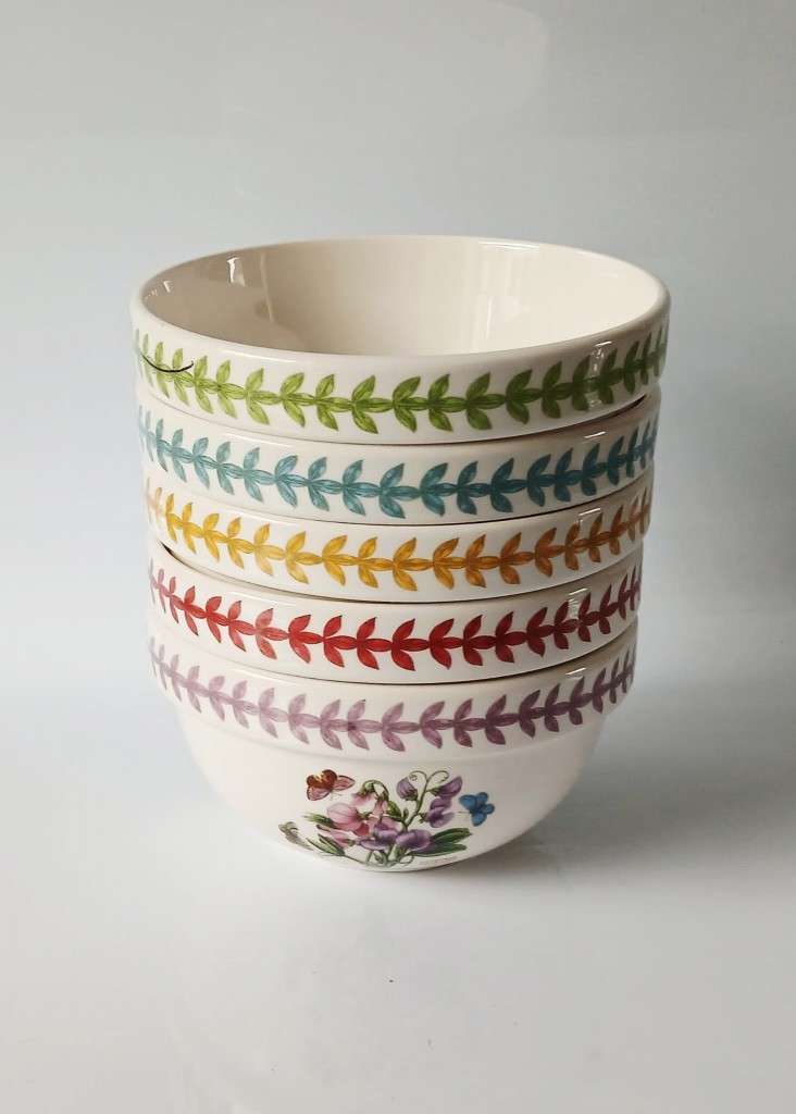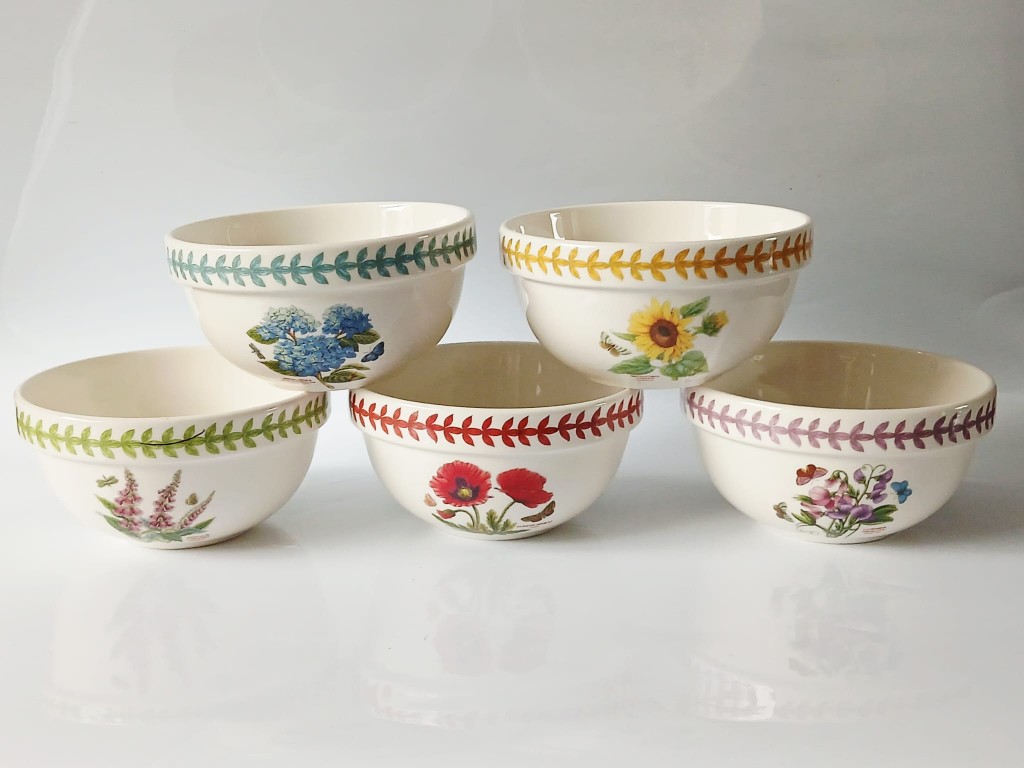 A set of five Portmeirion Botanic Garden Meadow bowls each with a different design. The bowls consist of Lathyrus Odoratus (Sweet Pea), Digitalis Purpurea (Foxglove), Hydrangea Macrophylla (hydrangea), Hellianthus Annuus (Sunflower) and Papaver Rhoeas (Poppy).