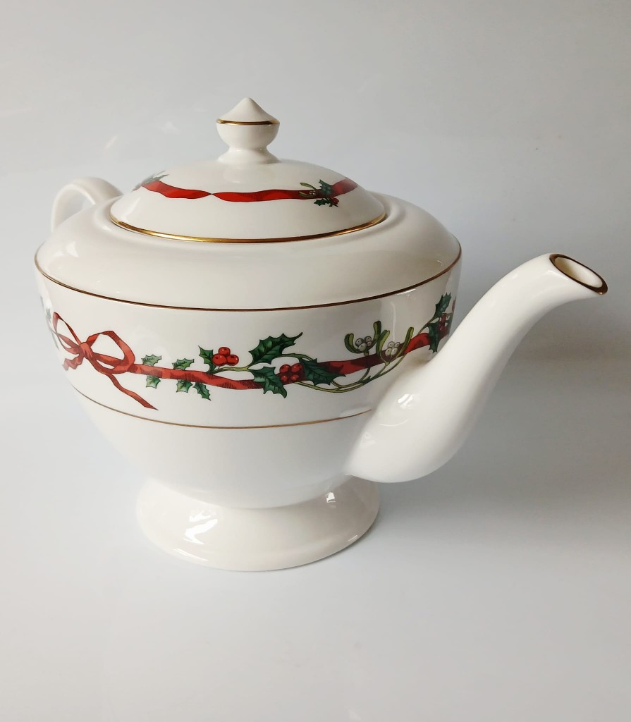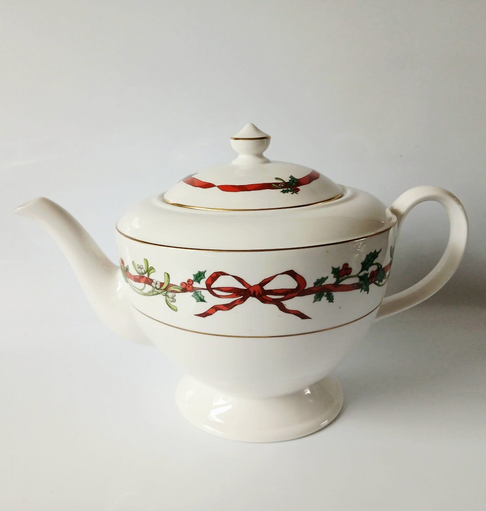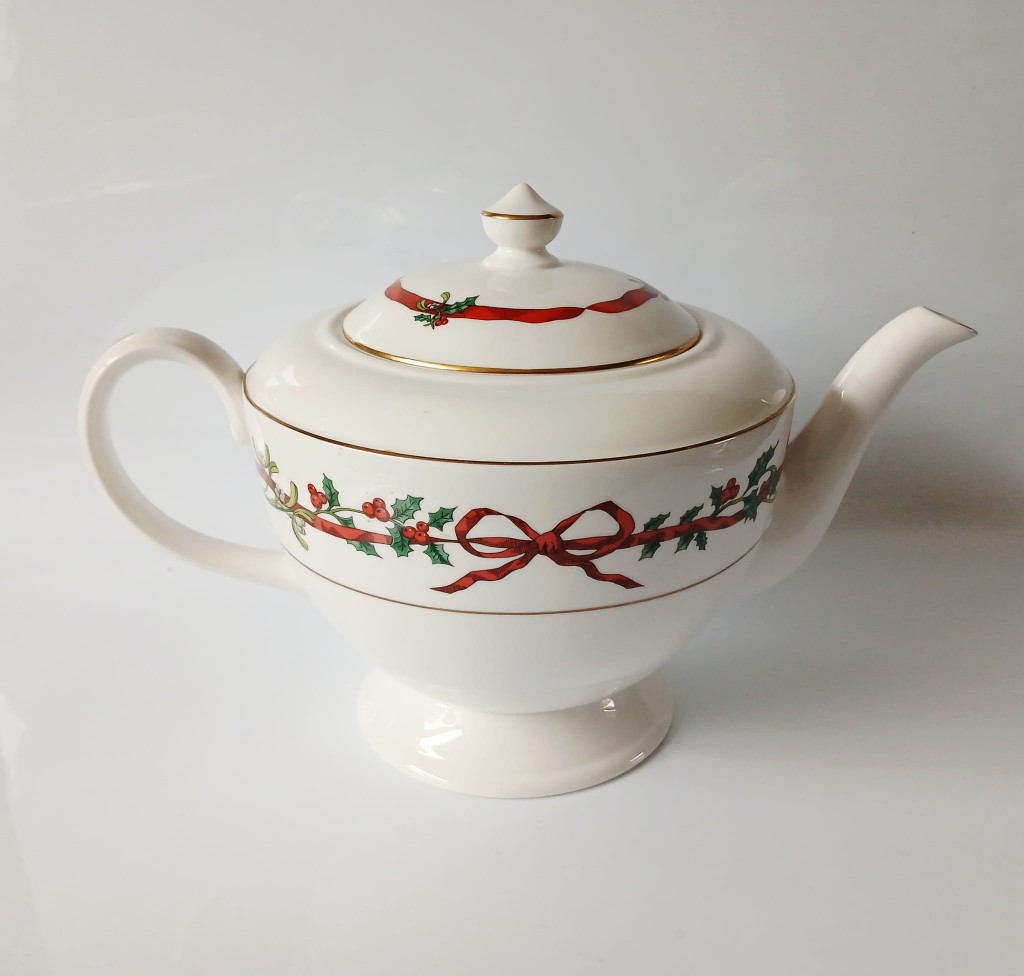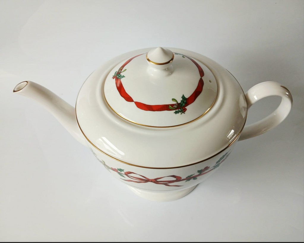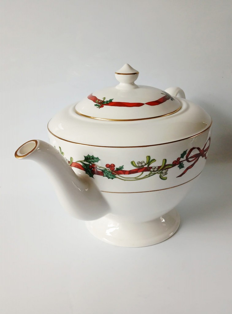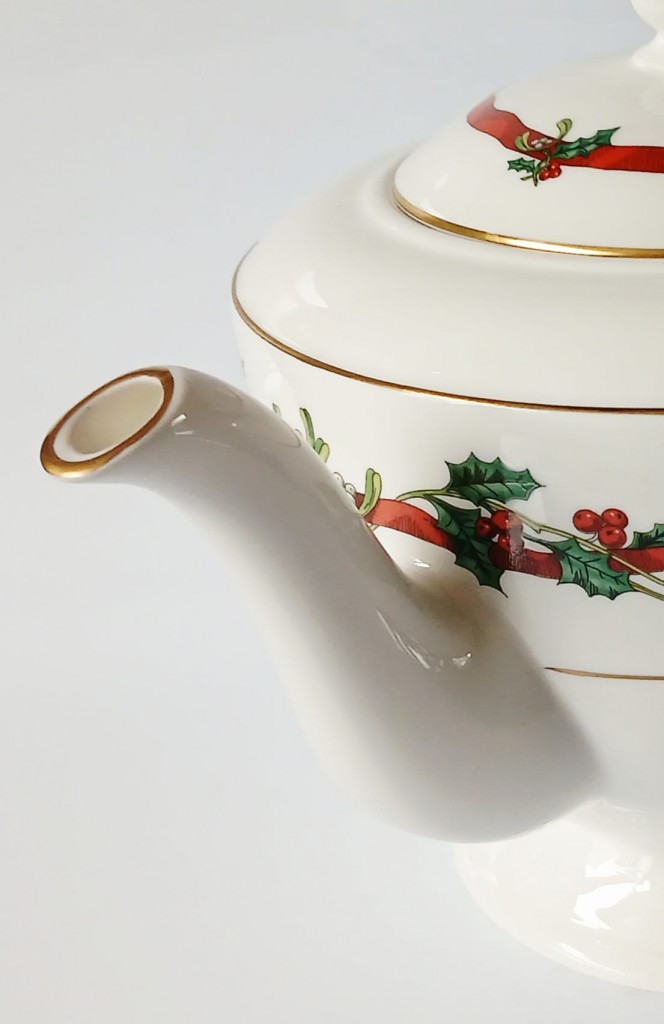 The teapot features festive holly, mistletoe and red ribbons with a gold trim.