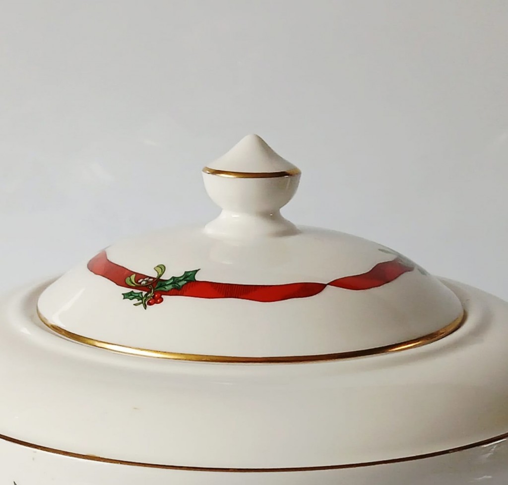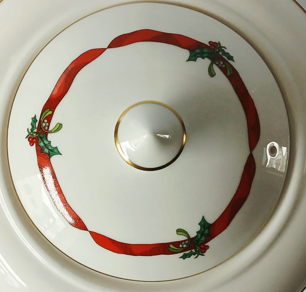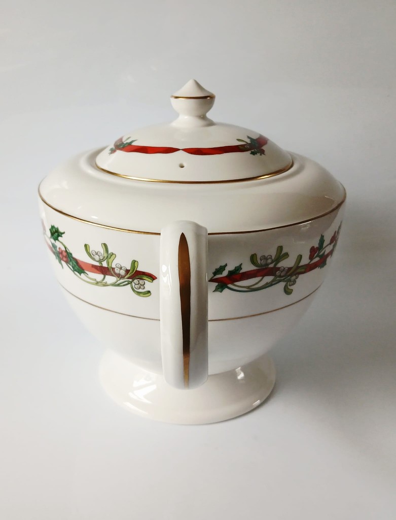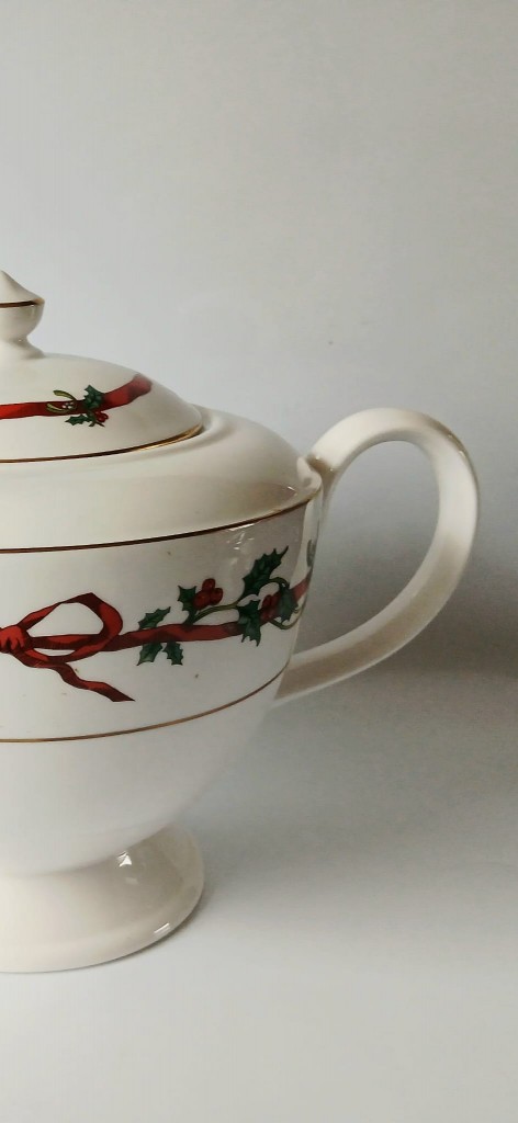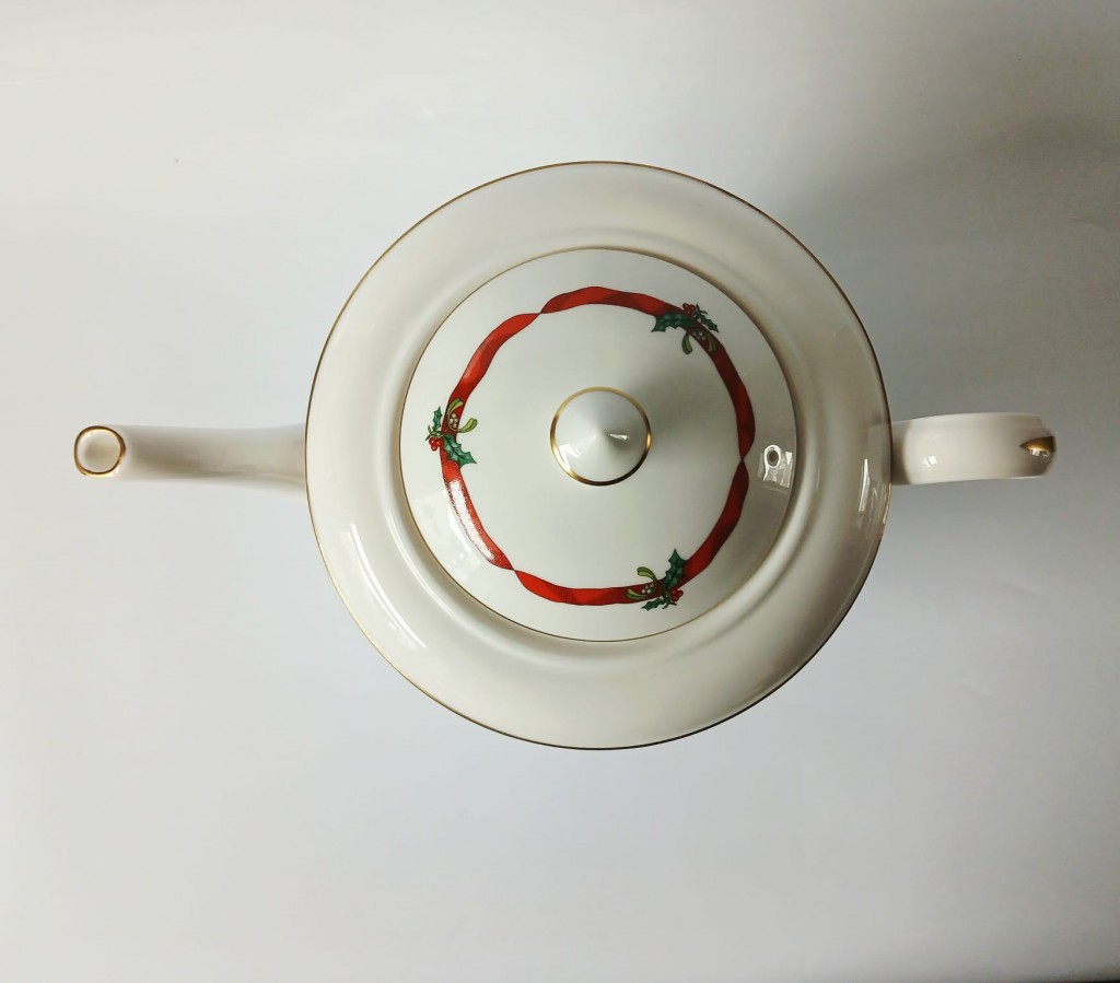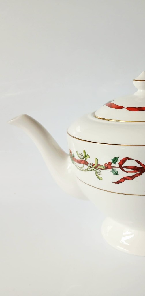 The teapot features festive holly, mistletoe and red ribbons with a gold trim.