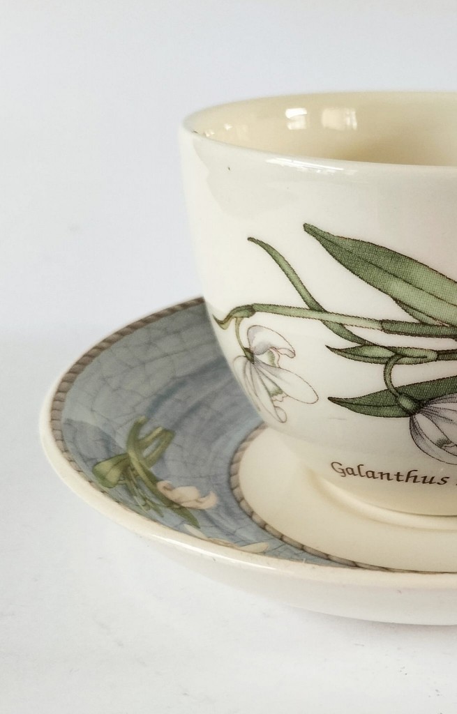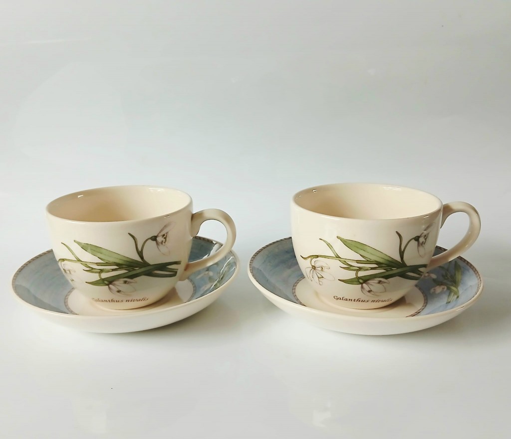 A set of two Wedgwood Sarah's Garden tea cups and saucers both featuring Galanthus Nivalis (Snowdrops).