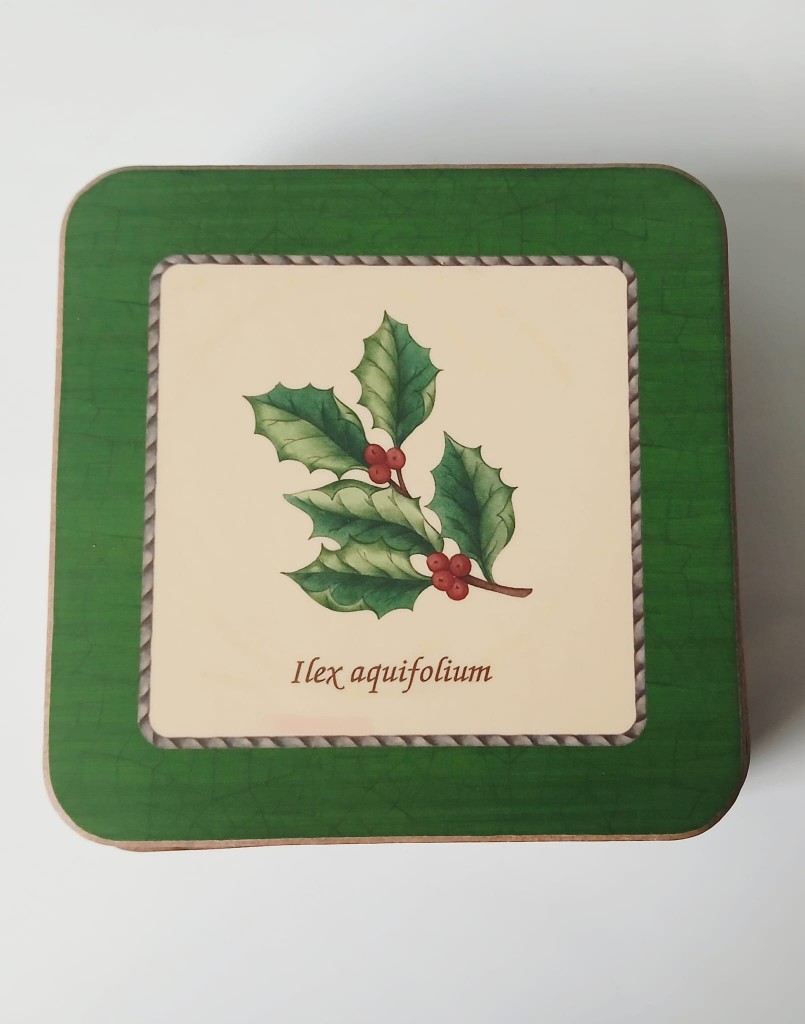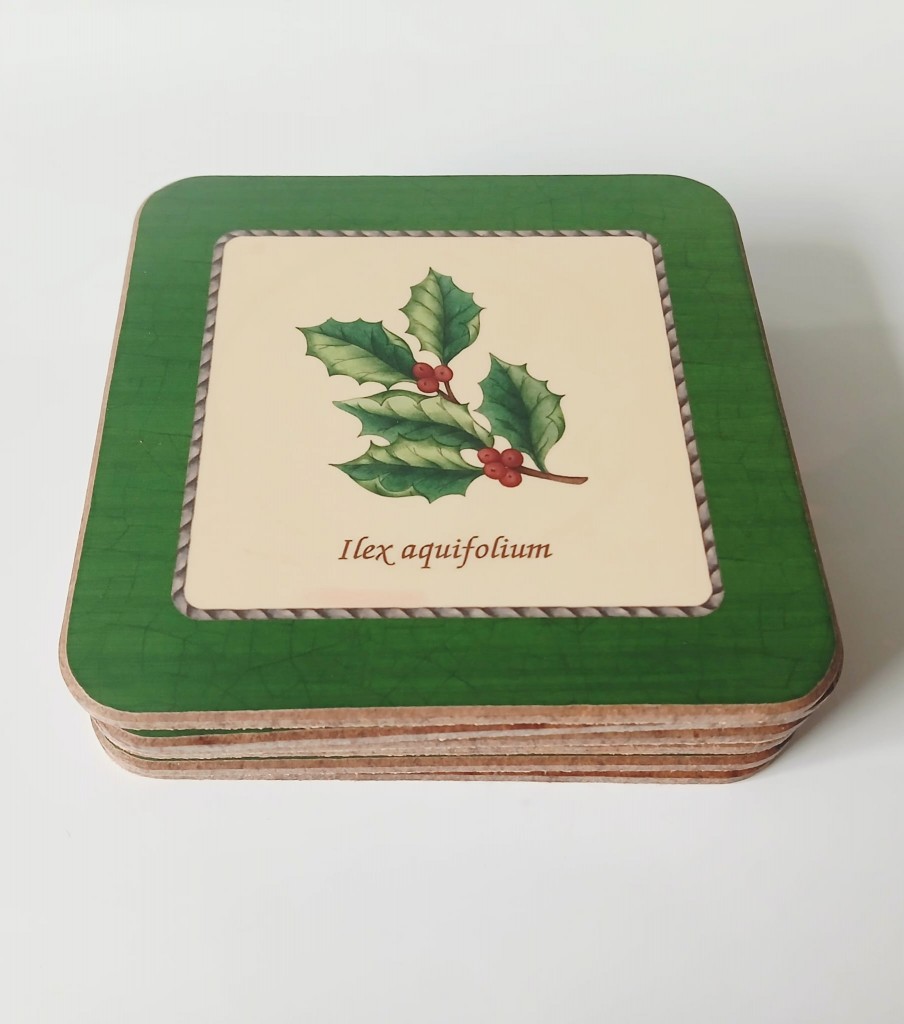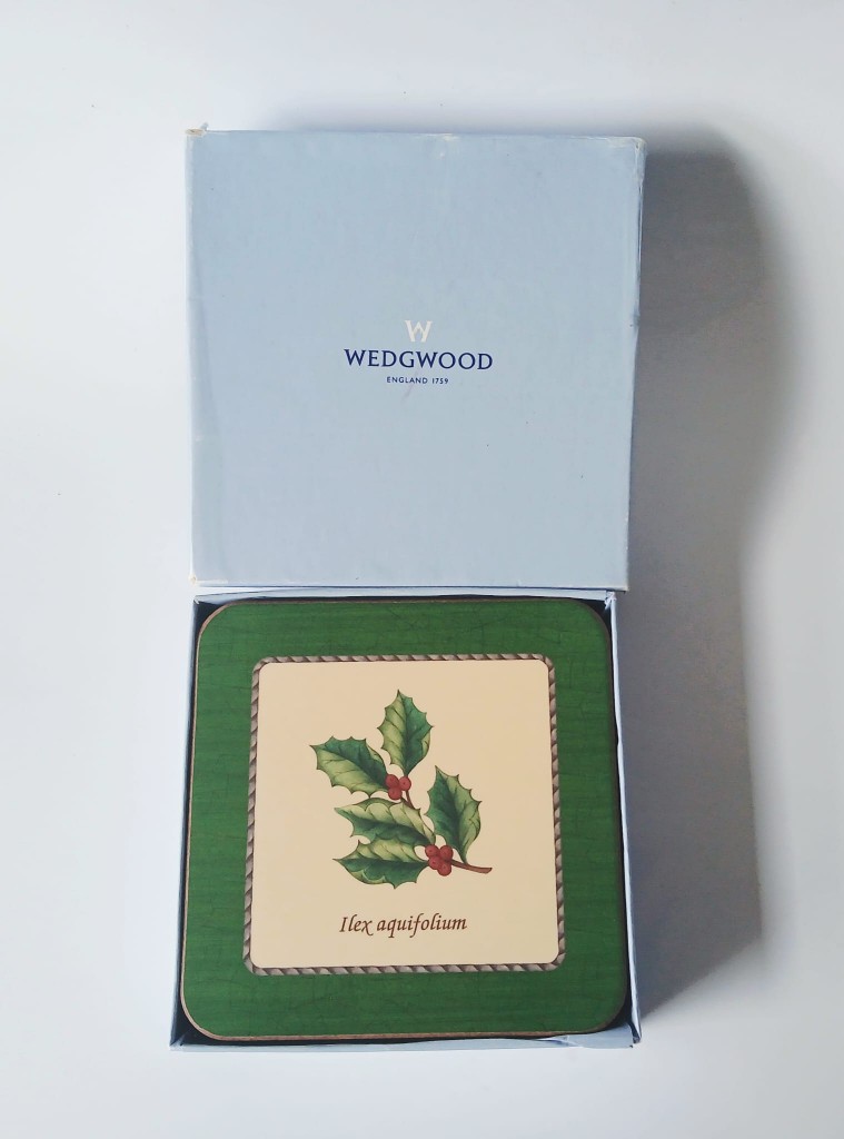 A set of six Wedgwood Sarah's Garden cork backed drink coasters featuring Ilex Aquifolium (holly).