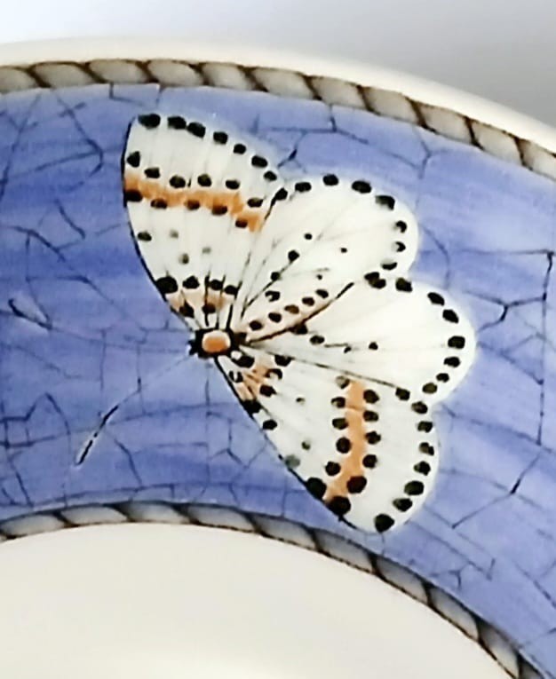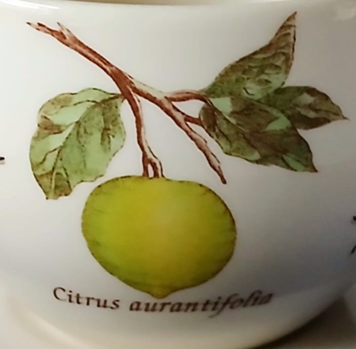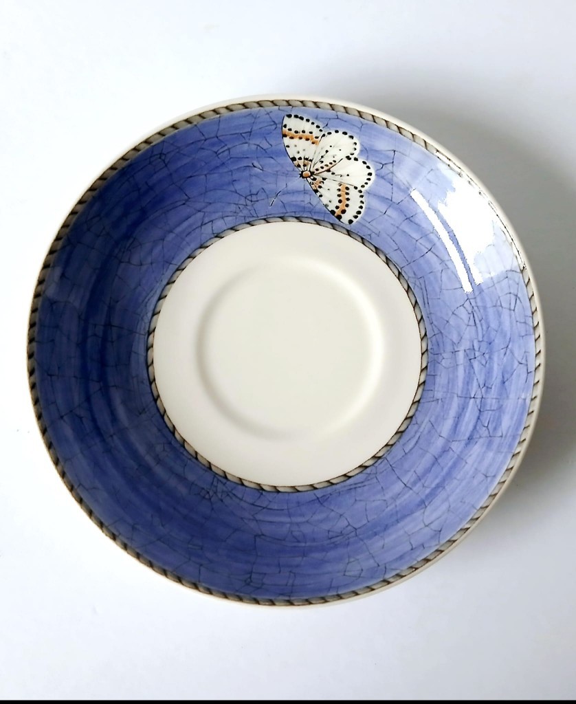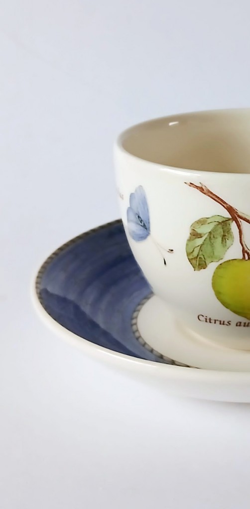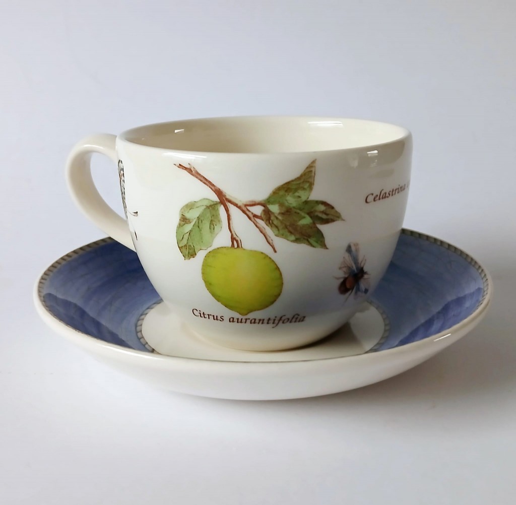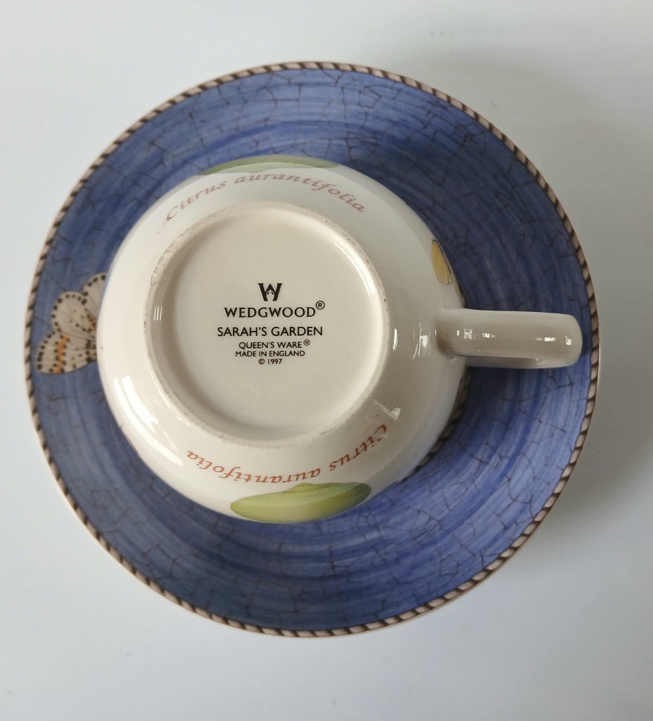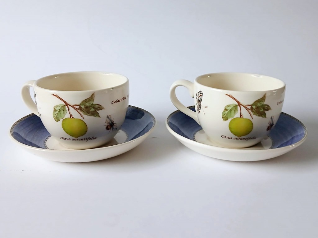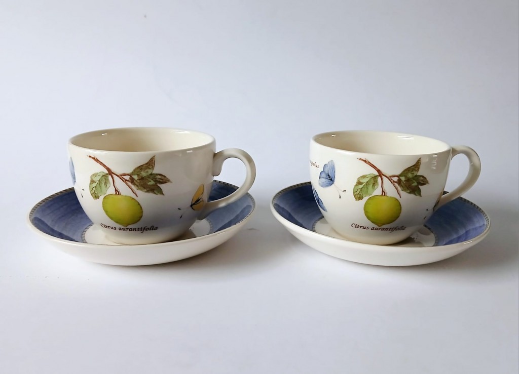 A set of two Wedgwood Sarah's Garden tea cups and saucer. The cups feature Citrus Aurantifolia (key lime) and the saucers have a blue crackle effect rim and a butterfly.