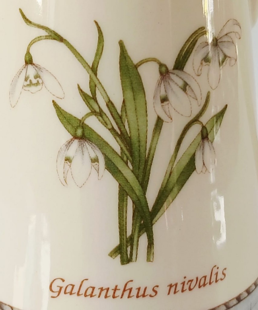 A Wedgwood Sarah's Garden cream jug featuring a blue rim around the bottom and Galanthus Nivalis (Snowdrops) on the front with instructions of how to make your own Peppermint Tea on the back.