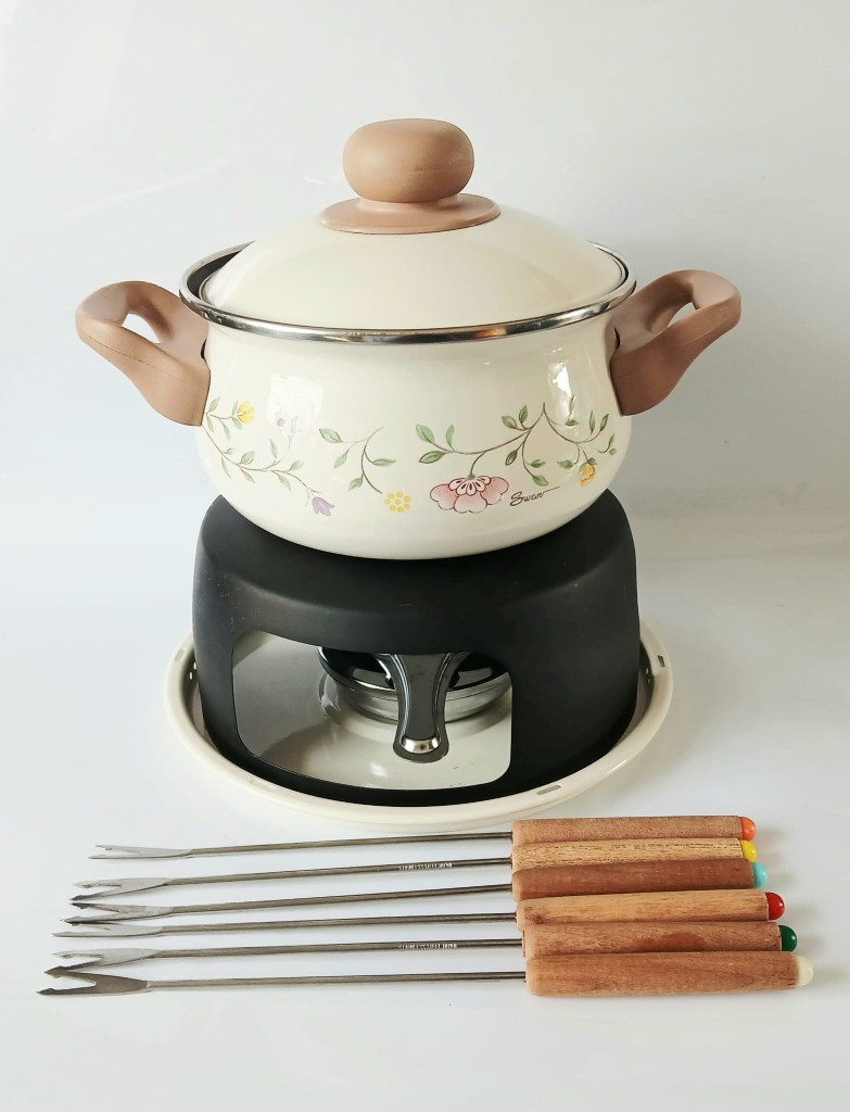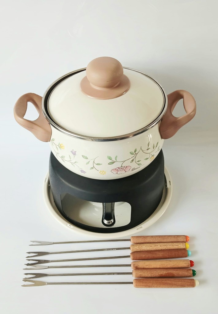This set comprises an enamel fondue pan which is Teflon non-stick coated, a stable stand, burner and filling measure and six fondue forks each one with different coloured end.