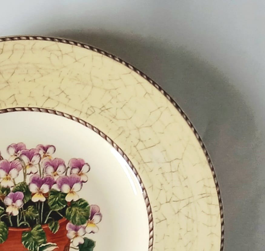 A set of four Wedgwood Sarah's Garden salad plates featuring a cream border and 'Viola Tricolor'.