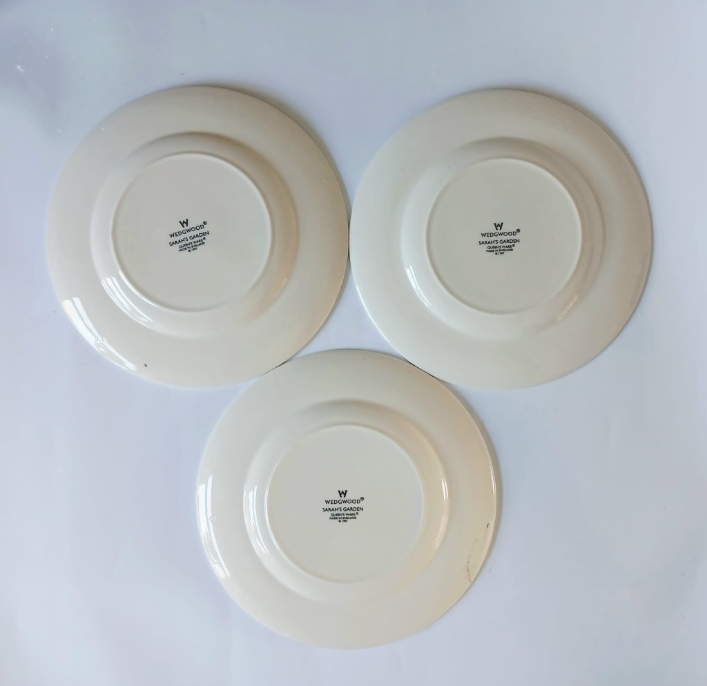 A set of three Wedgwood Sarah's Garden salad plates featuring a green border and 'Fragaria Vesca' (Wild Strawberries).