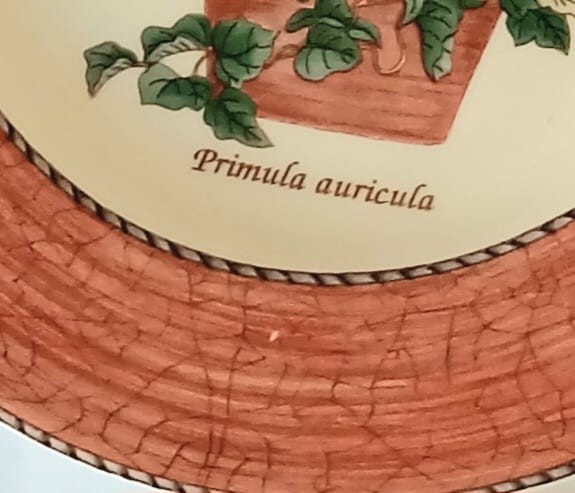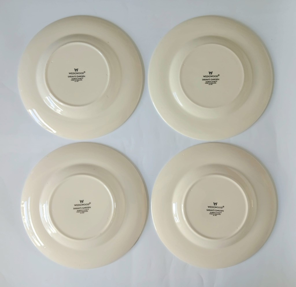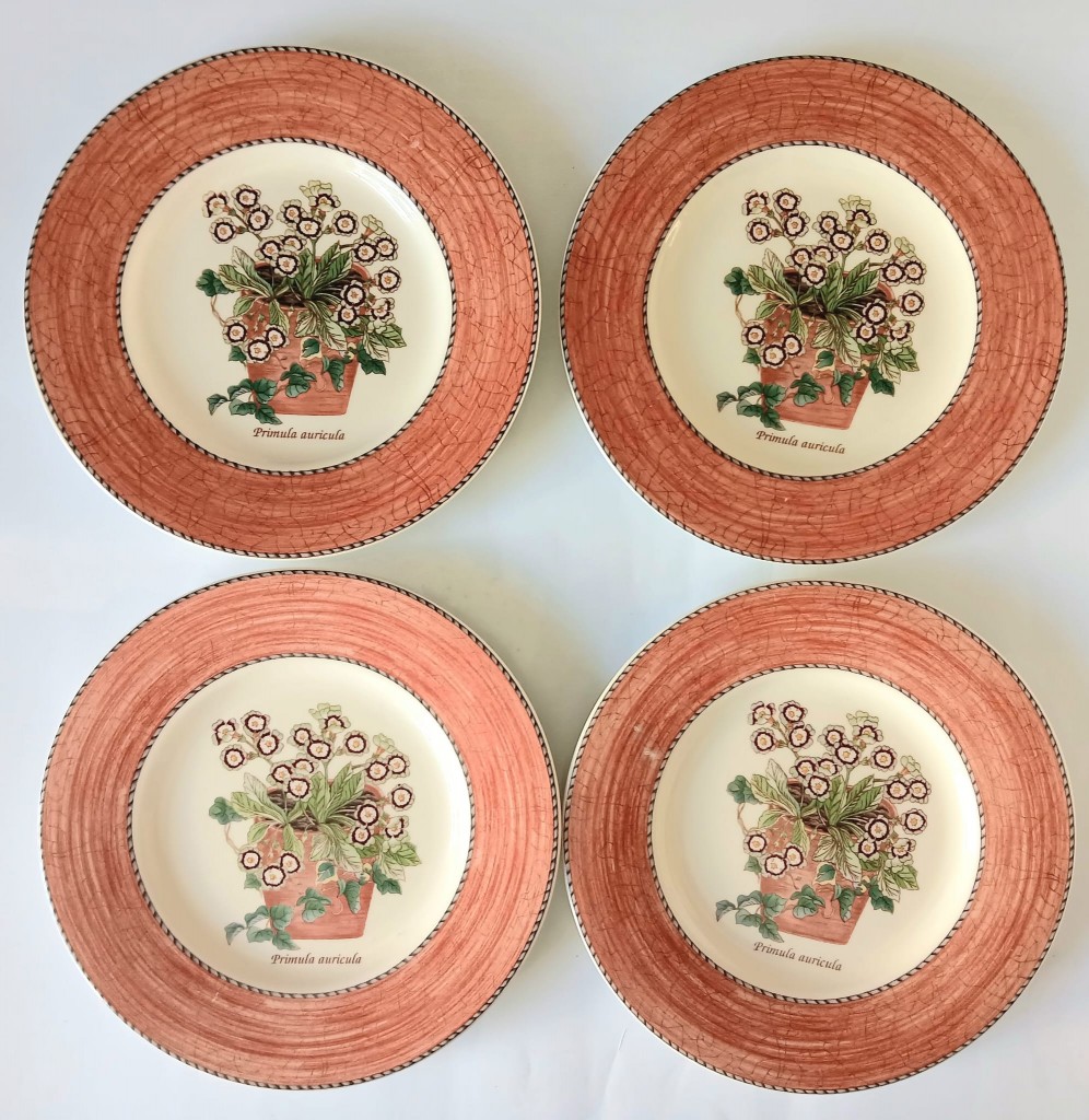 A set of four Wedgwood Sarah's Garden salad plates, featuring a terracotta crackle border and the Primula Auricula.