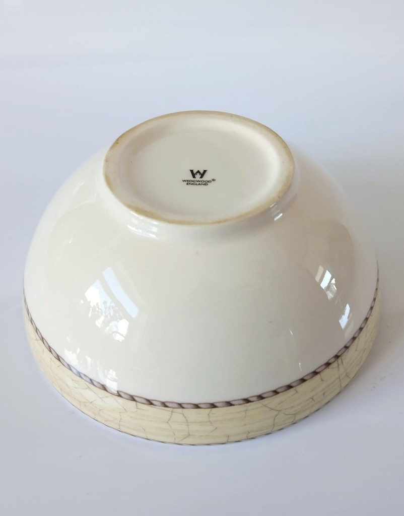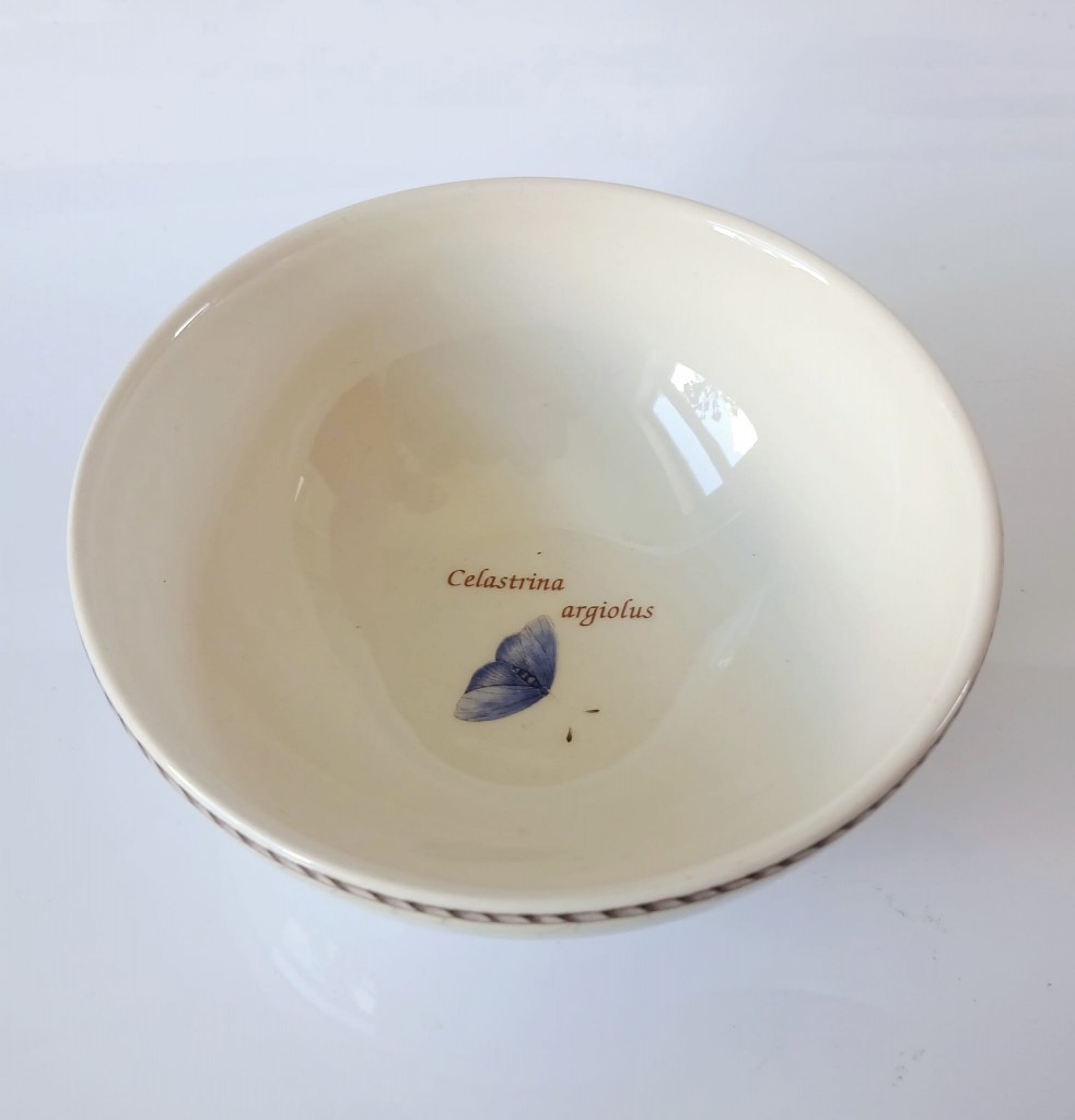 The bowl has a cream crackle effect border around the rim and a Celastrina Argiolus (holly blue butterfly) in the bottom.