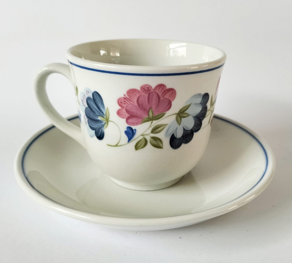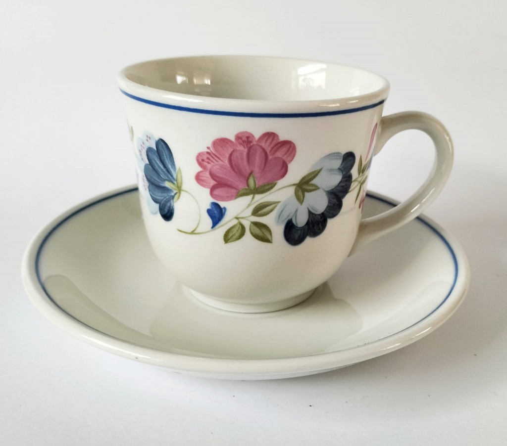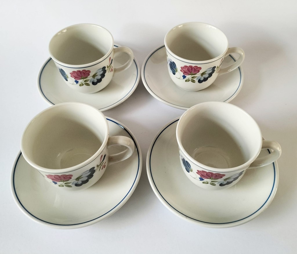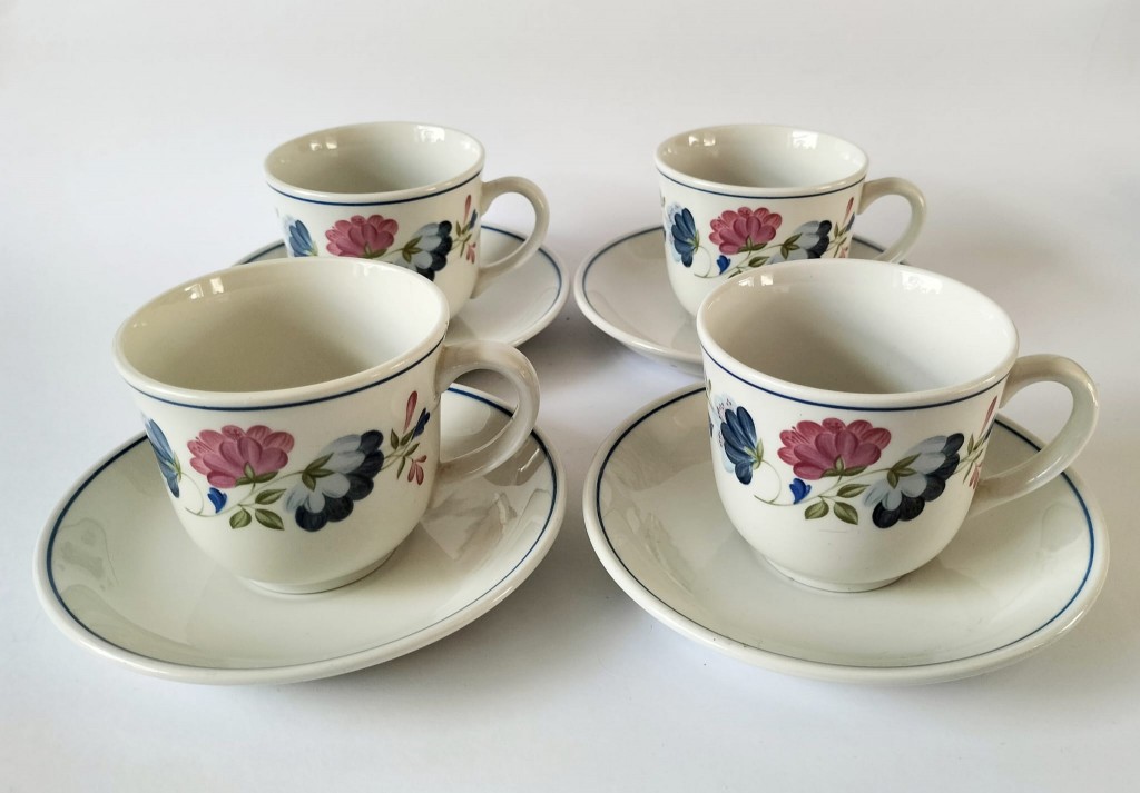 Each tea cup measures approximately 3 1/2 inches in diameter and stands approximately 3 inches tall and the saucers measure approximately 5 3/4 inches in diameter.